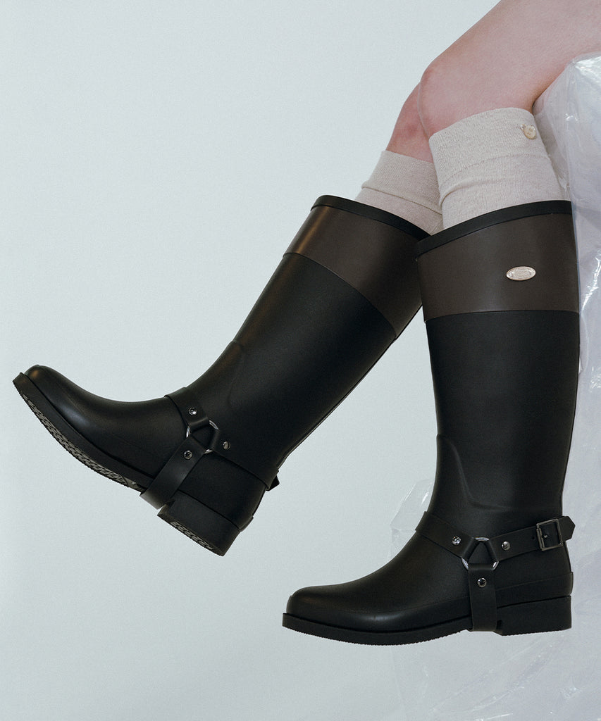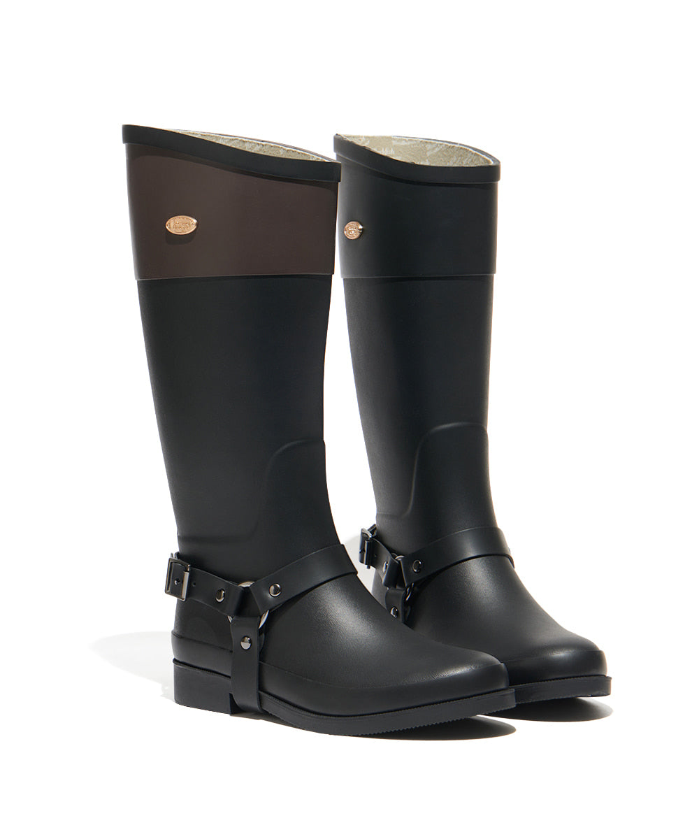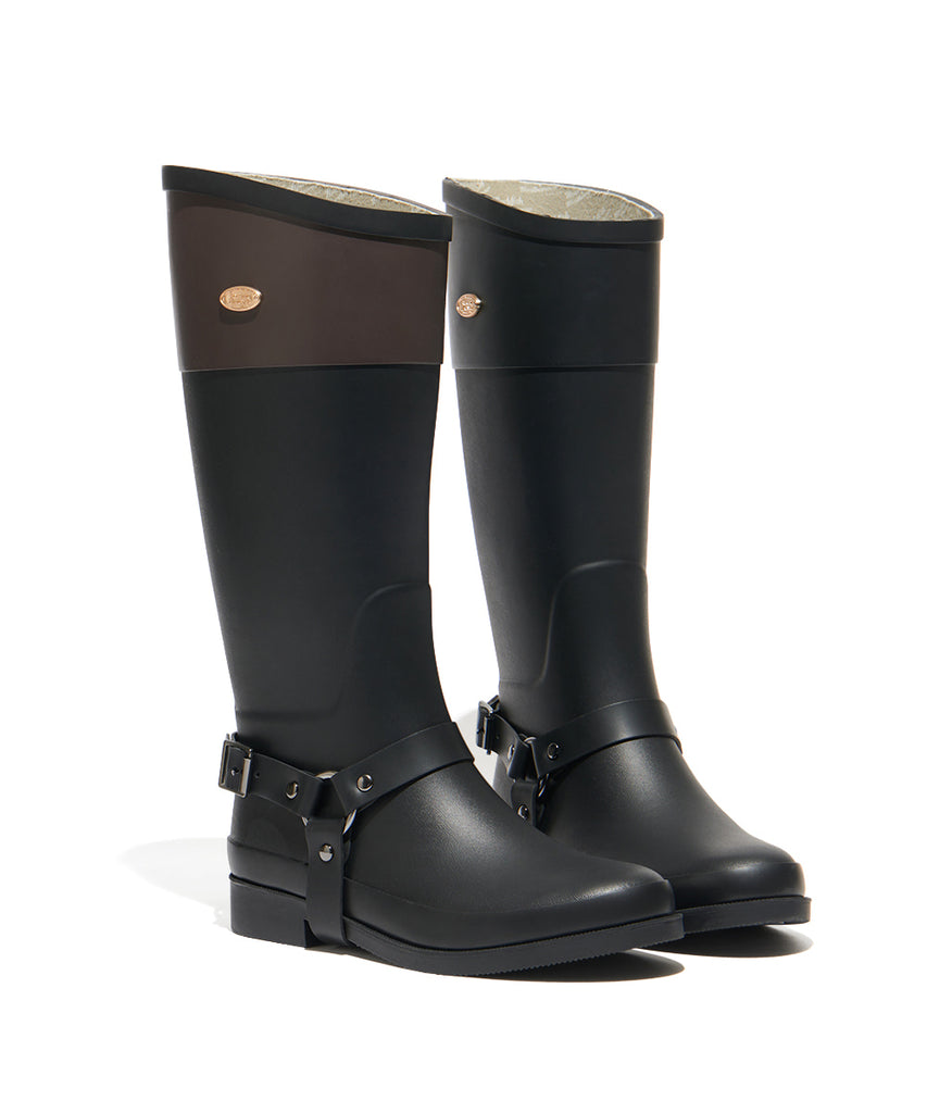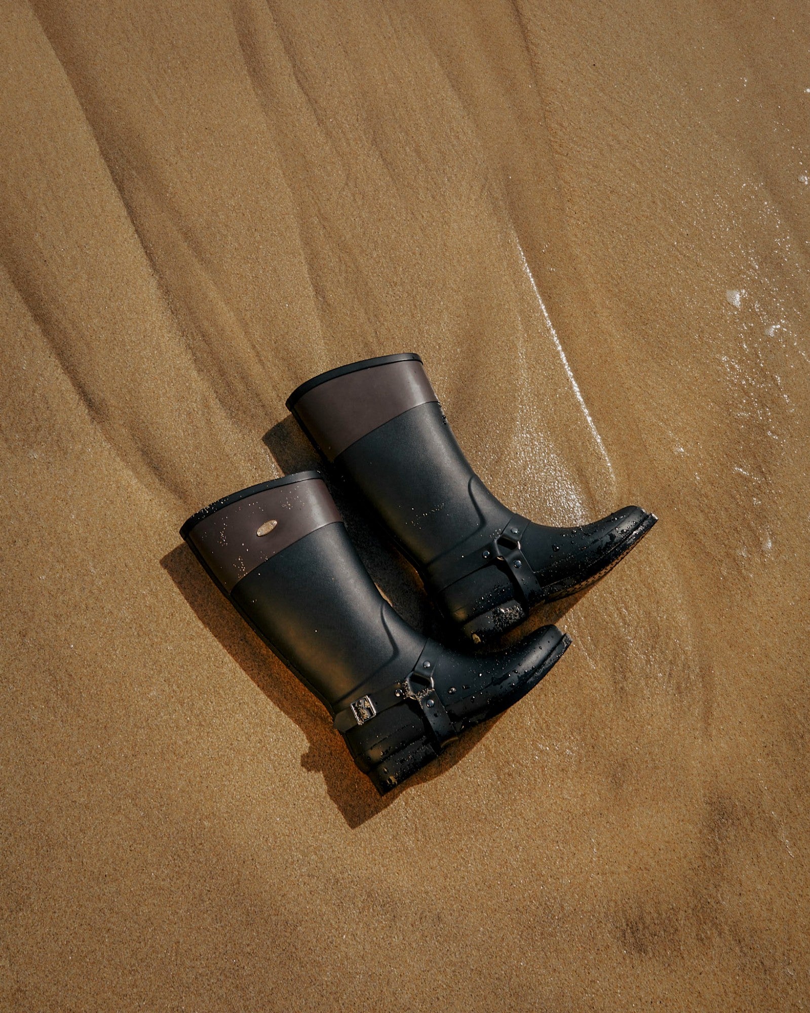 This harness-style Wellington rain boot features a distinctive diagonal top-line cut and buckle harness detailing that add a touch of luxury to a classic silhouette.